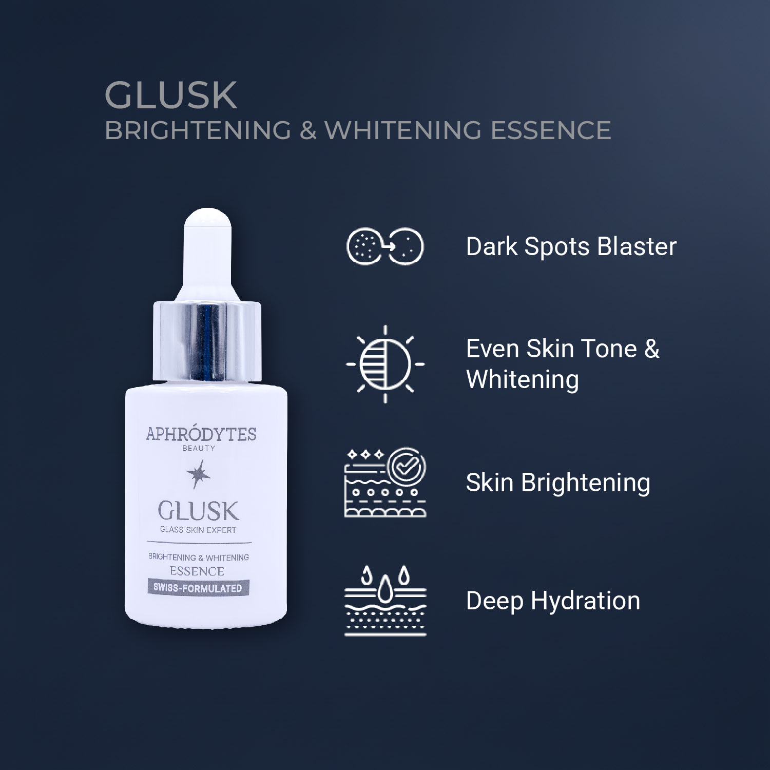 Transform your skincare routine with the complete GLUSK set. This collection includes the APHRÓDYTES GLUSK Brightening & Whitening Essence, GLUSK Triple Action Gel Cleanser, GLUSK Instant Hydration Facial Mist, and GLUSK UV Protection + Daily Tone-Up Primer Sunscreen. Together, they cleanse, brighten, hydrate, and protect your skin, leaving you with a radiant, glowing complexion.Why This Set?