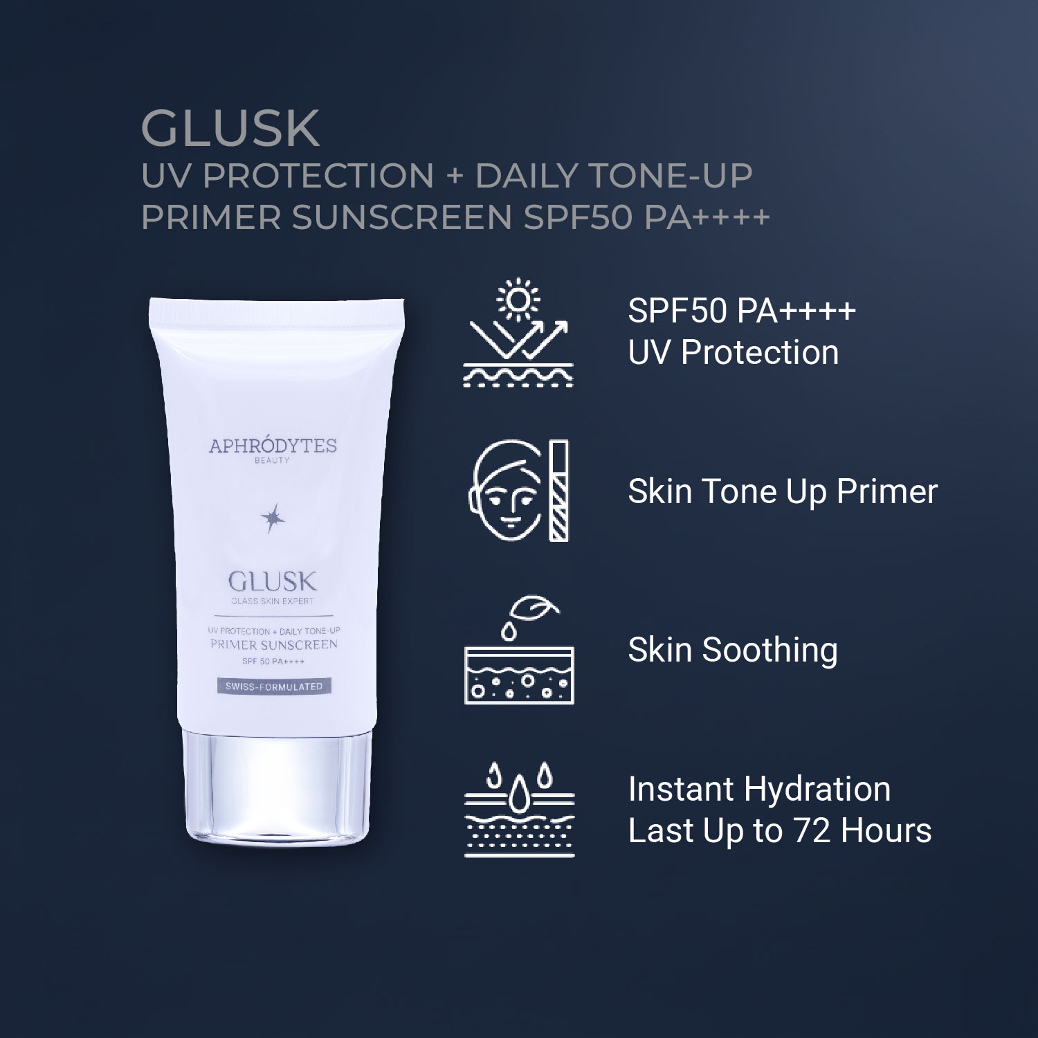 GLUSK UV Protection + Daily Tone-Up Primer Sunscreen SPF50 PA++++ combines advanced sun protection with hydrating and priming benefits for comprehensive skin care. Scientifically developed, this sunscreen delivers long-lasting hydration, protects against environmental damage, and promotes a radiant, even-toned finish.